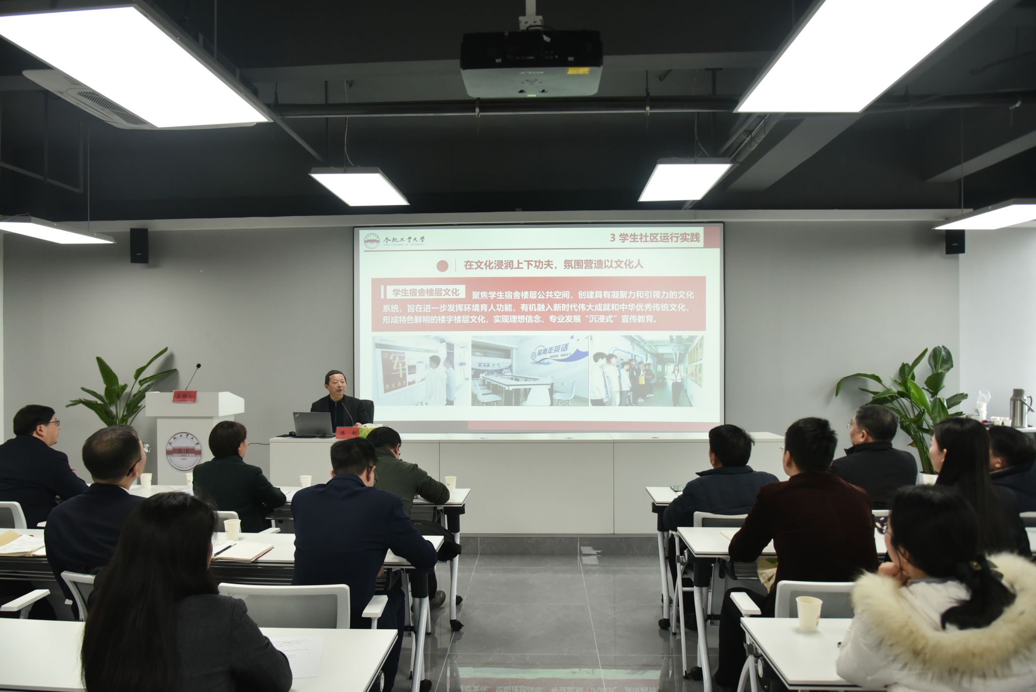 陈刚在报告中围绕我校“一站式”学生社区的建设目标、工作理念、社区氛围、社区平台详细阐述了学生社区建设情况。他在报告中指出,学校始终坚持以学生为中心,顶层谋划,多措并举,在“六个方面”下功夫,确保学生社区运行:一是在协同联动上下功夫,立体多维同频共振,成长教育、业务服务、教育实践、师生队伍,构筑起社区场域多维和育人力量协同;二是在制度保障上下功夫,有效运营常态长效,保障学生社区“门常开、人常在、灯常亮”;三是在价值引领上下功夫,宣教融合铸魂强基,建设“三个阵地”,推进“三向教育”,打造“三味课堂”育人平台;四是在文化浸润上下功夫,氛围营造以文化人,建设各具特色的楼宇和楼层文化,打造最美宿舍,建设“书香社区”,浓郁社区文化氛围;五是在平安创建上下功夫,全时全域稳定校园,以全天候值班、四级网格化管理体系等细致举措推动工作有效开展;六是在智慧赋能上下功夫,贴心驿站一网通办,“智慧学生社区”投入使用,实现“数据多跑路、师生少跑腿”。