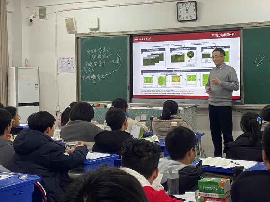 相关情况,并以科普讲座的形式分别向同学们介绍了大数据与人工智能、虚拟现实、可视化、物联网等计算机相关领域的前沿技术进展,引导同学们树立“科技创新,强国有我”的志向。讲座结束后,同学们就计算机、人工智能等热点领域争相提问,并一一得到了老师们的解答。