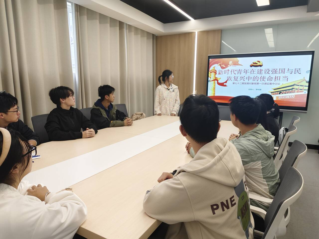 11月6日学院第72期党校发展对象班学员在翡翠湖校区2号楼学生社区会议室开展“新时代青年在建设强国与民族复兴中的使命担当”主题讨论。