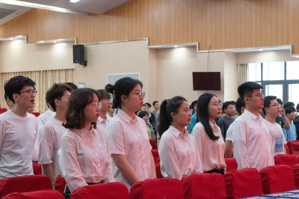 大会在庄严的国歌声中拉开序幕,全体人员肃穆而立,将学习二十大的青春激情融入国歌铿锵有力的节奏之中。