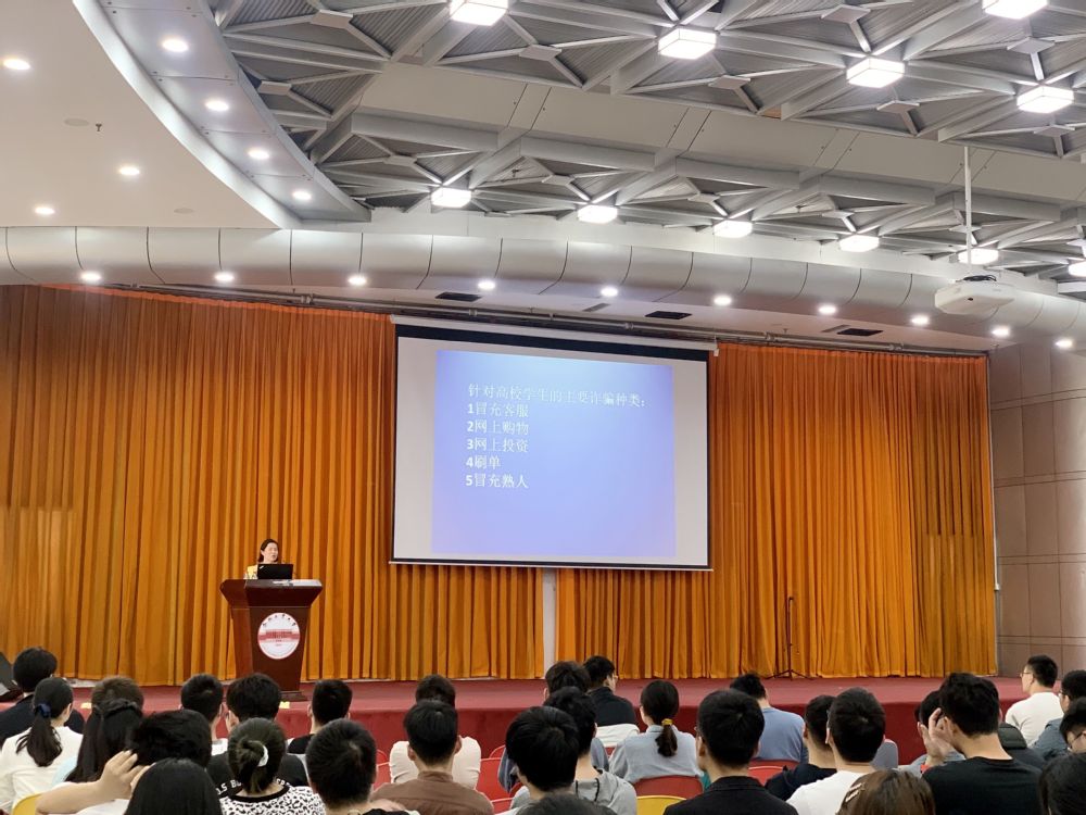 党委保卫部付老师则以近期发生的校园电信诈骗事件为例,结合防诈骗宣传手册,详细介绍了冒充客服注销校园贷、网络贷款诈骗、网络兼职诈骗、网络购物诈骗、网络刷单等多种常见诈骗手段,使同学们对电信诈骗的严重危害性产生更加深刻的认识。推荐同学们下载“国家反诈中心”APP,并嘱咐同学们遇到电信诈骗要沉着冷静,及时向学校保卫部门、老师寻求帮助。