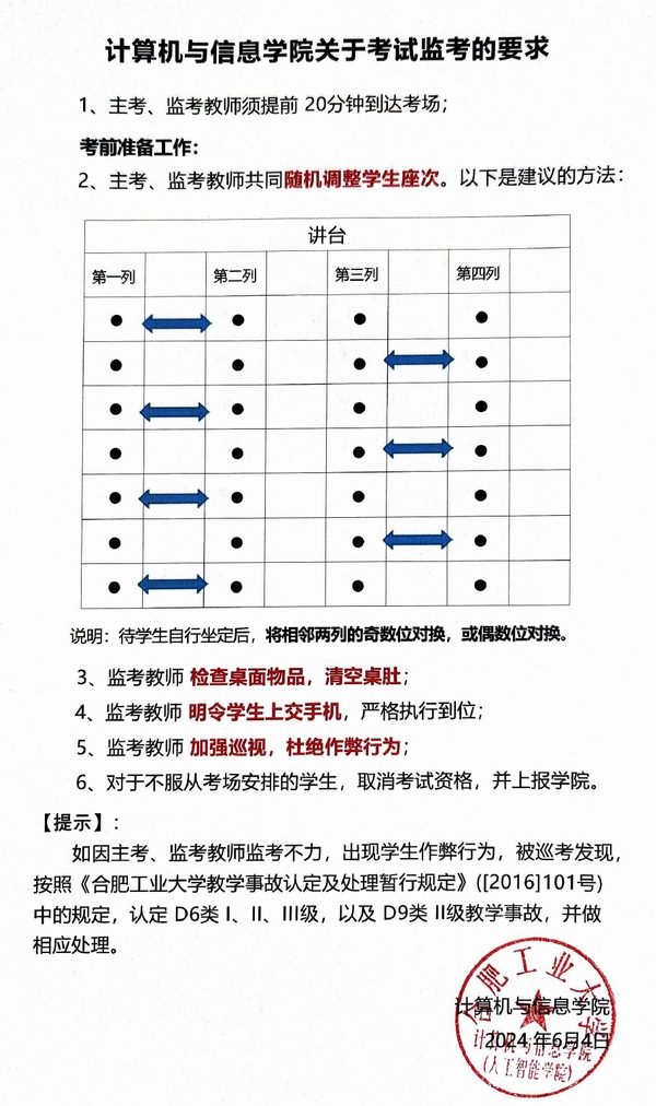 为进一步严肃考风考纪,增强当代大学生的诚信意识,营造风清气正的考试风气,学院根据《禁漫 考试管理细则》和《禁漫 学生违纪处分办法》对考试“监考”做出以下要求。同时,将组织学院教学指导委员会全体委员开展考试巡考督查(长期)。