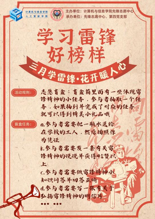 本科生第四党支部与学院先锋志愿中心于3月19日在新区一食堂下沉广场联合举办“三月学雷锋,花开暖人心”主题宣传学习活动。