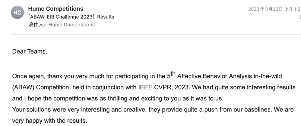 图4.ABAW竞赛组织方的结果通知邮件(部分)