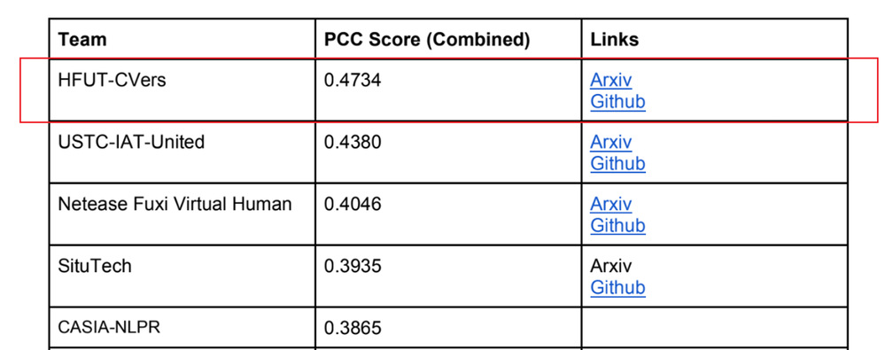 洪日昌教授、汪萌教授带队,李佳老师、陈银(研一)、张雪松(博一)、聂建涛(研一),李自强(大二)、于洋晨(大四)组成了一支师生队伍,最终在情绪反应强度估计赛道上以显著优势取得了冠军(如图2,竞赛网址://ibug.doc.ic.ac.uk/resources/cvpr-2023-5th-abaw/)。据悉,美国斯坦福大学、南加州大学,新加坡南洋理工大学、俄罗斯国立高等经济大学、中国科大、中国人民大学、网易伏羲、华为、北京思图科技等众多该领域顶尖团队也参加了情绪反应强度估计赛道,竞争十分激烈。