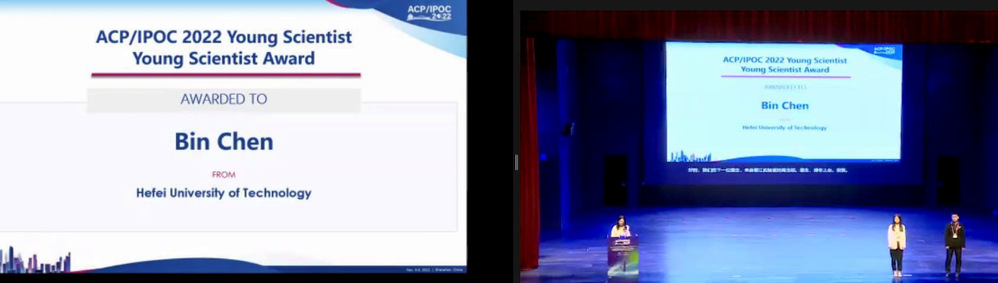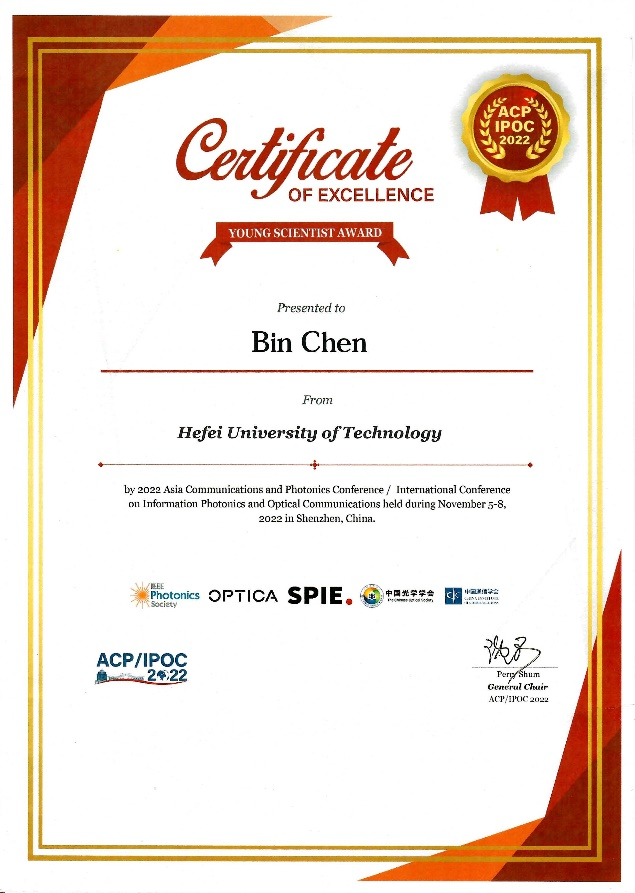 陈斌副教授从数十位申请人中脱颖而出,荣获“ACP/IPOC 2022青年科学家奖”。该奖项旨在表彰光通信、光子学领域40岁以下优秀青年学者,经国际知名专家组成的评委会评选,本届共设4人,另外三名学者分别来自北京邮电大学、南方科技大学、之江实验室。