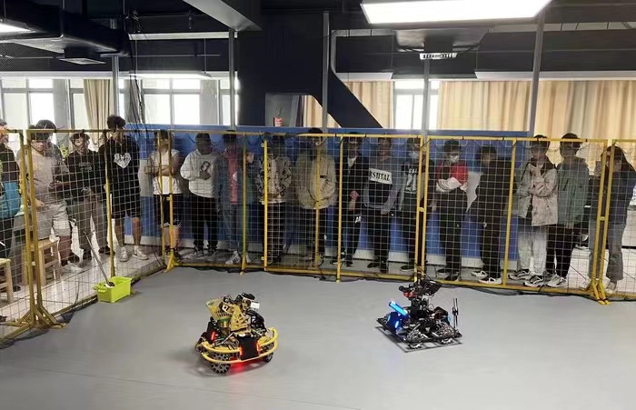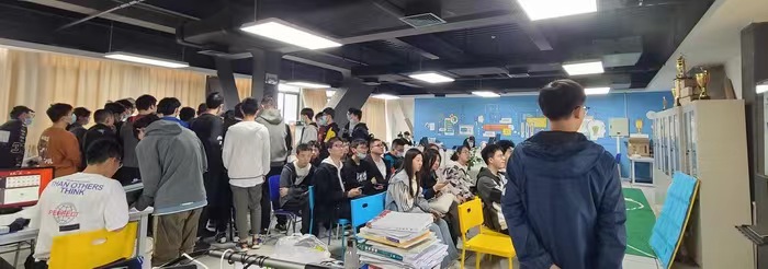 在D603机器人技术实验室,苍穹战队的成员们首先为同学们介绍了RoboMaster赛事的情况;然后介绍了苍穹战队所取得的历史成绩以及研制的多兵种机器人;随后进行了对战演示,让同学们感受了机器人技术的魅力,近距离认知了机器视觉、运动控制、结构设计等技术之美。同学们情绪高涨,现场气氛热烈。
