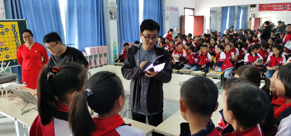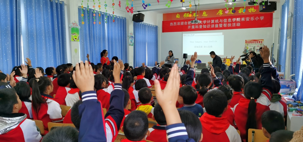 和计算机与信息(人工智能)学院的情况,并期望同学们好好学习,将来到合工大甚至更好的大学学习和深造。余烨博士向同学们讲述了计算机科学技术和人工智能在交通、家居生活等方面所带来的进步。曹力老师则从学生感兴趣的画画入手,介绍了在动画制作过程中计算机技术的运用。吴文明老师介绍计算机科学技术在房屋设计和虚拟现实场景展示方面的应用。整个讲座化难为易,符合小学生的认知特点,开拓了视野、启发了兴趣、埋下了种子。报告过程中,同学们不断举手提问,并时而报以热烈的掌声。