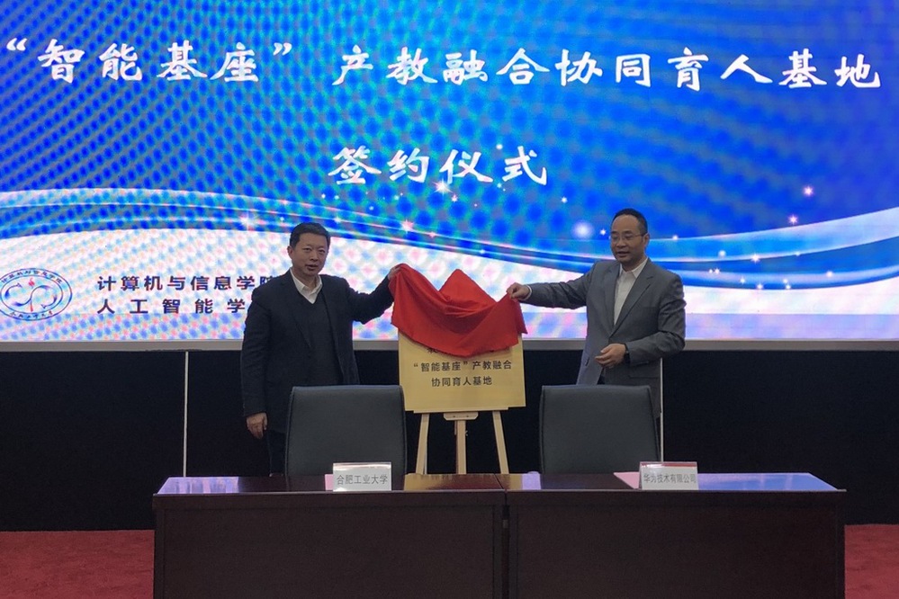 党委副书记陈刚与华为技术有限公司副总裁郑叶来代表校企双方为“智能基座”产教融合人才基地揭牌;禁漫