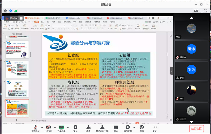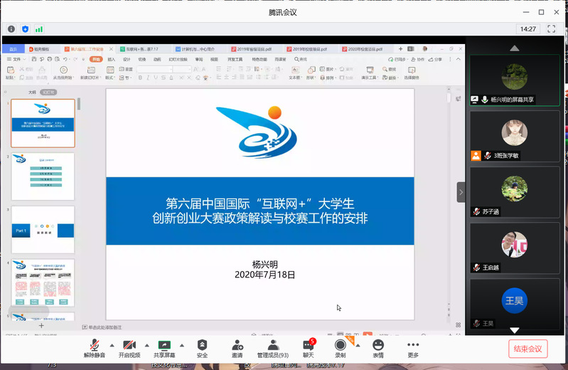 通过腾讯会议召开了第六届中国国际互联网+大学生创新创业大赛线上培训会,学院创新创业中心杨兴明老师主讲,报名参赛的150余名项目负责人参加了此次培训。