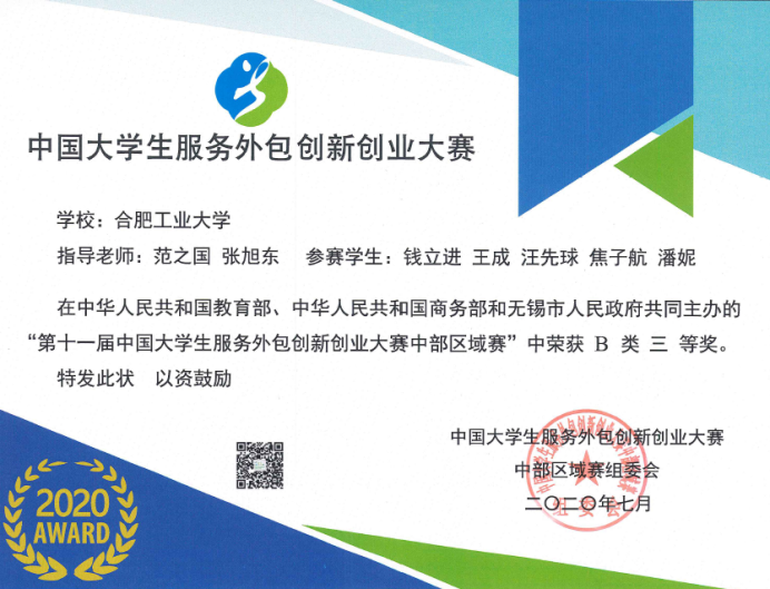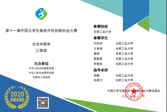 在2020年“服务外包大赛”中部区域赛中,仪器学院的“易贷宝”项目和计算机学院提交的“钢水液位偏振成像智能监测系统”项目分别获得中部区域赛二等奖和三等奖。近日,2020年“服务外包大赛”决赛比赛结果公布,“易贷宝”项目获得A组三等奖。以下是大赛获奖作品网页展示截图和国赛、区域赛获奖证书。