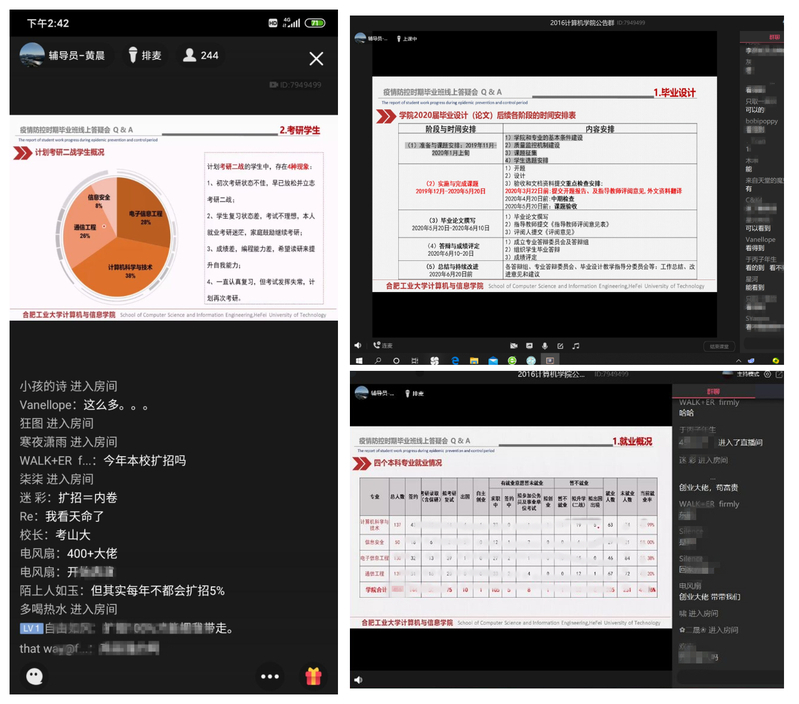 线上开课第一周,以毕业班教育引导为专题的第四次空中课堂《疫情防控期间毕业班线上答疑》开讲,毕业班辅导员黄晨老师担任主讲,以毕业生课业学习和毕业去向两大专题为切入点展开课程内容,近250名同学参加了此次线上会议。在课业学习专题中,重点针对学院毕业设计进程安排和符合毕业条件的学分核算工作进行详细梳理,尤其提醒存在学业困难和创新学分不足的学生高度重视,努力补修学分,争取顺利毕业;在毕业去向专题中,将前期与每位学生“点对点”真实就业需求的调研数据,以本科四个专业为单位,依据专业能力、考研复试学校、求职意向地、出国、就业等不同群体进行指标分类建库,用图表数据的方式向全体毕业生展示当前各专业的就业情况,重点对比近3届毕业生同期就业概况,着重分析计划考研二战的人群类型分布,让学生更好的明确自我生涯规划,避免盲目跟风。同时将前期面向45家用人单位发放的《禁漫