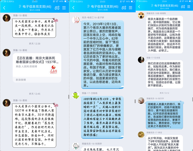 在本次活动中,电子信息工程本科生党支部全体成员共同观看了南京大屠杀死难者国家公祭日仪式直播。仪式结束后,同学们纷纷在线上发表感言。姜晗同学:这段惨痛的历史应该被牢记。作为新时代的大学生党员,要勿忘国耻,珍爱和平,以国家的繁荣富强、和平安定为己任,不懈奋斗。胡潮:曾经,我们被外敌蹂躏,如今,我们以国家的名义祭奠,擦清历史之镜。作为党员,更应明白身上的重担,不忘历史,牢记使命,为振兴中华而奋斗!翟培铭:丧钟为不幸的逝者而鸣,也将为忘记苦难,曾一度失去精神信仰的民族而鸣。不要让南京大屠杀纪念馆作为一个景点而被后人铭记,而是作为一段永不被尘封的历史让后人永记于心。