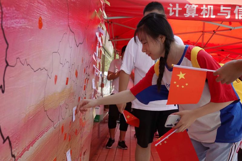在翡翠湖校区第一食堂广场举办“执笔告白我的国,青春同框新时代”迎国庆特别活动,工大师生积极参与,在便利贴上写下对祖国的祝福和对美好未来的期待之情张贴在地图展板上,并合影留念。