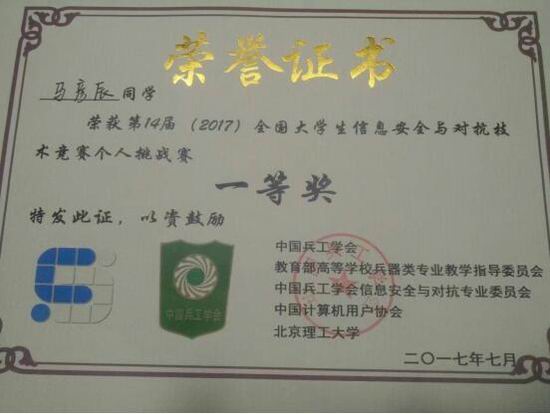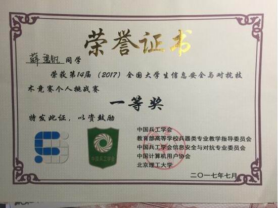 赢得荣誉,如在西安电子科技大学举办的第八届全国网络安全技能大赛(XDCTF2017)和在北京理工大学举办的第14届全国大学生信息安全与对抗技术竞赛(ISCC2017) 中,C1SEC都从全国参赛的数百支队伍中杀出重围,凭借过硬的基本功、清晰灵敏的思路和专注的意志力均大赛季军,并荣获二等奖;在上海举办的“观安杯”管理运维挑战赛(ISG2017)中,C1SEC荣获教育行业二等奖;在杭州电子科技大学举办的“问鼎杯”全国大学生信息安全大赛中荣获三等奖;在西安举行的陕西省网络空间安全大赛中荣获三等奖。