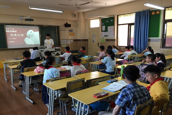 主讲人龚志伟首先以著名的动画形象——机器人大白为导入,引发了同学们对本次课堂的强烈兴趣,将机器人按功能分为:传感型机器人、交互型机器人、自主型机器人三种类型,联系对应的实例,如机器狗、阿尔法狗、机器人足球赛……生动的将三类机器人的特点和区别展现出来。同学们对这种形象的介绍非常感兴趣,一个个都认真的听着,还不时举手发言说出自己的理解看法。其中有关阿尔法狗的短视频引发了同学们对“人工智能是喜是忧”的思考和讨论。趁热打铁,主讲人对讲课的内容进行了提问,也让同学们对智能机器人发表自己的看法,并对参与回答的同学进行了奖励,同学们积极思考、踊跃发言,既巩固了同学们的学习成果,也鼓励同学们对于科学发展发表自己的看法。“机器人会给我们的生活带来更多的便利”、“人们会越来越懒,会生病。”等充满童真的感悟,看似简单,却反映了孩子们对未来人类与智能机器人关系的思考。