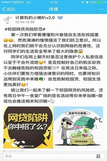 目前不良“校园网贷”事件时有发生。为增强学生风险防范意识和自我防护能力,禁漫