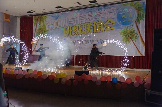 灯光一暗,晚会的开场节目正式上演。四位双截棍社的社员身着道服,把双截棍耍得虎虎生风。更精彩的还在后面,随着灯光熄灭,双截棍上闪出绚丽的焰火,双截棍的舞动越趋华丽,一曲落罢,焰火停歇,同学们的热情已被彻底激起!之后四位主持人随着灯光的亮起一齐上台,精彩的开场白赢得现场掌声,之后的节目更是高潮迭起。歌舞剧《小丑漫游动物异世界》中小丑的精彩表演赢得全场喝彩。节目《爱》、《苹果杯子舞》歌舞双飞。吉他弹唱《谁的心在飞》更是让人惊叹我禁漫