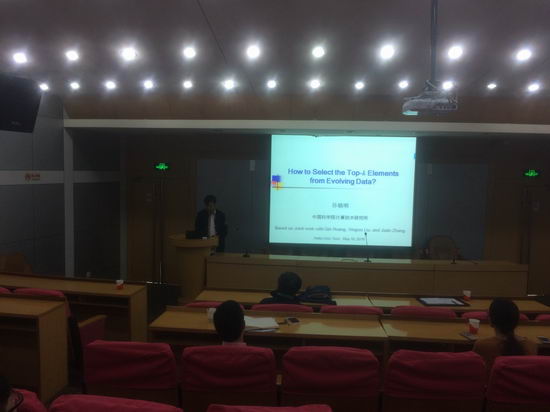 紧接着,孙晓明研究员做了题为 How to Select the Top k Elements from Evolving Data? 的报告。他介绍了研究top-k-selection的问题,即在一个动态的数据模型里确定和前k个元素的排序。在这个模型中,底层的总序随着时间的推移而演化,而这个次序只能通过成对的比较来探测。在此模型下,在此之前只有2个特殊情况下进行了研究:选择一个给定的排序的元素,和排序的所有元素。