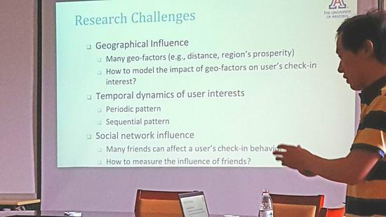 进行学术交流,并做了题为《Point-of-Interest Recommendations in Location-based Social Networks》的报告。报告由汪萌副院长主持,我校多个学院师生参加了此次交流。