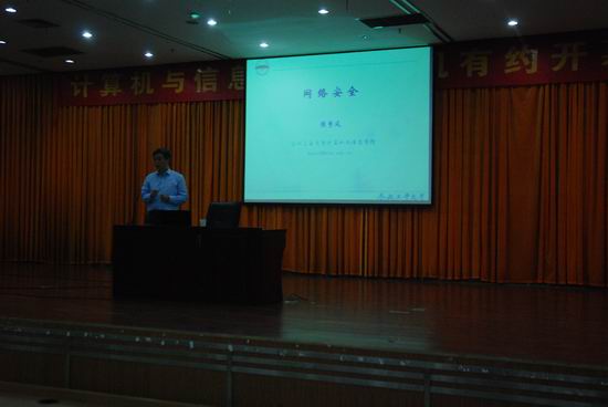 陈曾珍老师做了开场致词,提到了科技创新和实践能力的必要性,并且希望大家通过参与本届计算机有约活动,能够在今后的学习和成长中进一步树立科学的理想科学的态度,成为一个既有科学理念又有科学实践能力的复合型人才。之后侯整风教授就网络安全的各个方面,深度检测防火墙,门限秘密共享及应用,网络安全协议与技术等为同学们讲解,并教同学们提高网络安全的防范意识。让同学们受益匪浅。侯教授对于同学们提出的问题也一一进行了解答。至此计算机有约开幕式圆满结束。