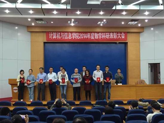 大会对2014年度学生评教中排序前二十名的个人授予了“2014年度学生评教个人优秀奖”;对2014年度科研项目纵向到账经费50万以上,横向到账经费100万以上的个人授予了“2014年度承担科研项目个人优秀奖”,现场举行了颁奖仪式并合影留念。