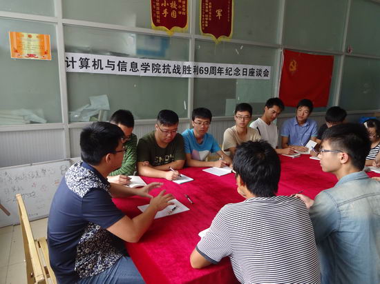 仪式观看结束后,在2013级辅导员石楠老师的主持下,同学们在纪念抗战胜利69周年座谈会上纷纷发言。王存同学说:“无数仁人志士前赴后继,抛头颅、洒热血换来了今天的幸福生活,需要我们用心珍惜,在和平年代的今天,不能麻痹大意,要用自己的实际行动为更加繁荣富强的祖国贡献力量。”宋培培同学说:“中华民族艰难抉择的存亡史,激励着我们奋勇向前,当今世界,科学技术是第一生产力,我们只有学好本专业知识,并将学习成果转化为科学技术,才能实现真正的人生价值。”