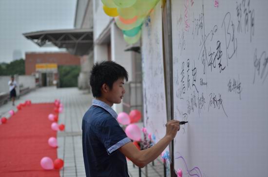 毕业欢送会从同学们陆续走上红毯的入场仪式开始,毕业生们,陆续缓步走向红毯,并在签名墙上签名留念,笔触划过的瞬间流露出对母校、老师、同学的依依不舍,也为自己的大学生活画上了浓墨重彩的一笔。在入场仪式的进行中,会场的大屏幕上播放着学院领导老师们的谆谆寄语,在座的毕业生们感触良多,思绪万千。