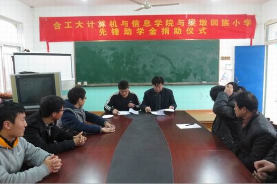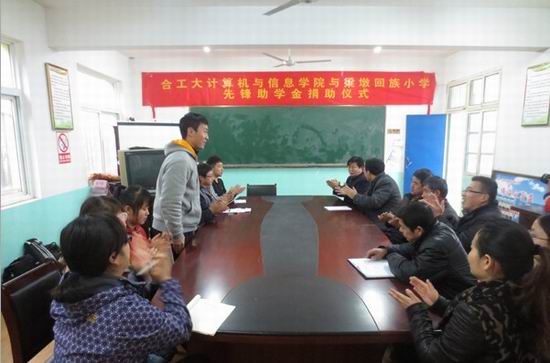 2012级国家奖学金获得者王晨光同学与学院第二届义卖节活动盈利额,用于奖励梁墩回族小学各年级优秀的家庭贫困学生,捐助仪式上,梁墩回族小学校长石立银对禁漫
