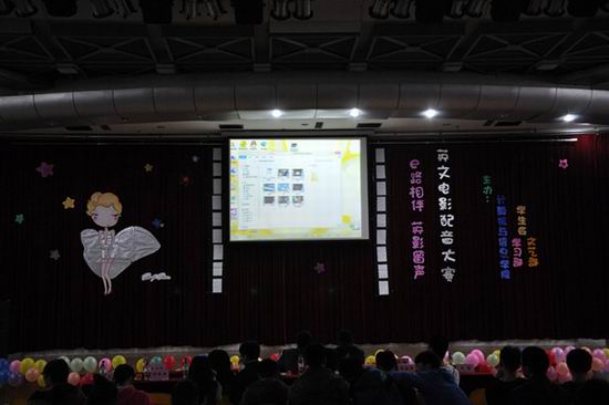 此次大赛由2013级九个班级通过遴选优秀口语代表组队参与比赛,比赛由电影现场配音和PPT讲解展示两个部分组成,从口语表达、现场氛围、展示内容、影片难度等方面对参赛团队进行综合考评,大赛组委会为参赛选手专门制作了录音棚。在比赛过程中,参赛队伍结合自身优势精心选取了各种情景片段,有奇幻片、动漫片、科幻片,选手们以流畅的口语表达、绘声绘色的演绎以及富有创意的全英文介绍,博得了在场观众的阵阵掌声。大赛组委会编辑制作的幽默搞笑的方言配音视频,充分展示了中国语言文化的博大精深。经过激烈的角逐,电子信息工程13-1班的以配音作品《怪物史莱克》荣膺此次大赛一等奖。