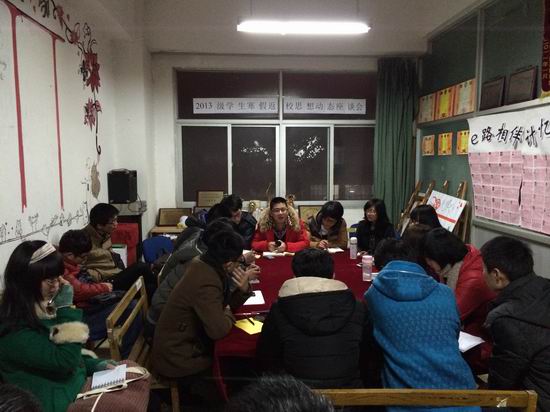 2013级学生寒假返校思想动态座谈会在翡翠湖校区举行,2013级各班班级代表出席座谈会。会议由2013级辅导员石楠老师主持。