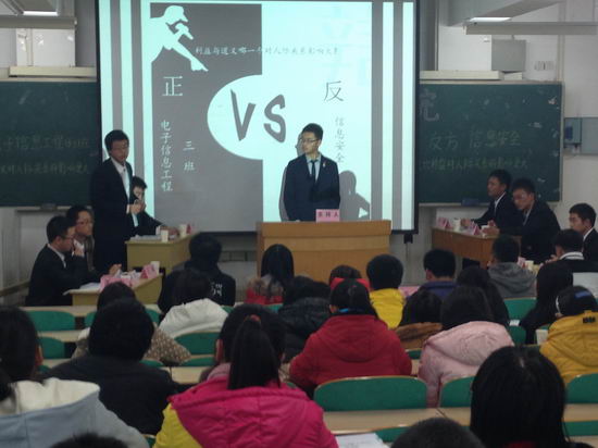 辩论赛正式开始前,由学习部的同学为大家带来了一场精心准备的趣味辩论赛,以诙谐幽默的情节感染着现场观众。随后,辩论赛正式开始,双方围绕 “利益与道义哪个对人际关系的影响更大”这一辩题,展开激烈辩论,在比赛中,双方辩手的观点有辩有论,各有千秋,现场气氛激烈,振振有词的辩解,灵活善辩的思维,令在座评委与观众赞叹不已。经过评委们的最终评定,电子信息工程3班获得此次2013级新生辩论赛的冠军,信息安全1班四辩获得“最佳辩手”称号。至此,历时两个多月的2013级新生辩论赛圆满落幕。