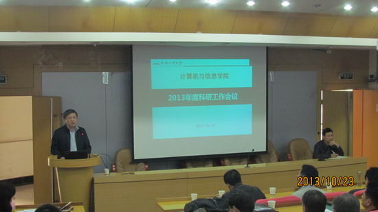 于10月23日在校学术会议中心二楼报告厅召开学院2013年度科研工作会议。副校长吴玉程、副校长刘晓平、学院领导、各系所中心负责人、全体教师参加了本次会议。会议由院党委书记蒋建国主持。