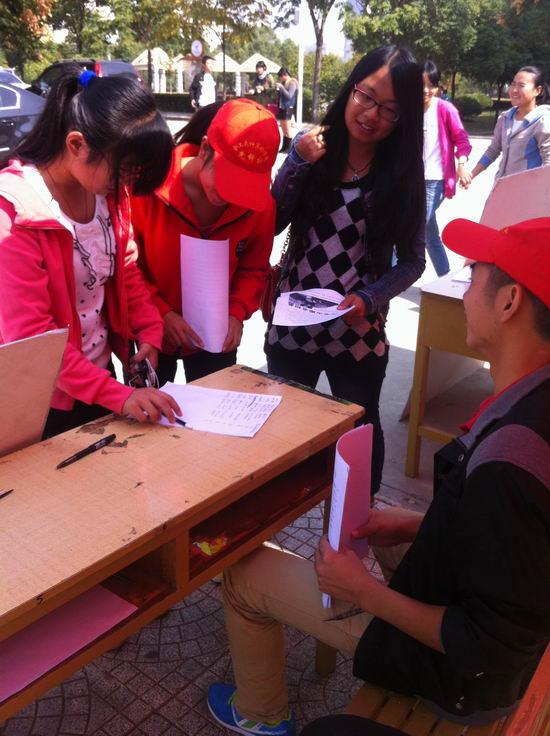 中午11时,先锋社社会实践部及组织筹划部在三食堂广场前展开了宣传及招募活动。此次活动中,得到同学们的热烈欢迎,全校同学积极报名,下午13时,本次活动圆满结束,共招募全校6个学院的60余名志愿者。