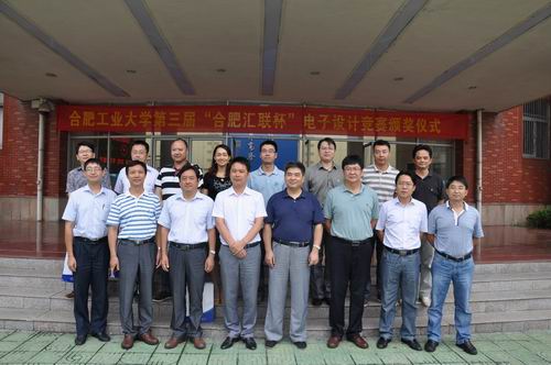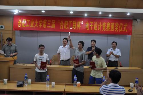 在接下来的颁奖仪式中,由刘晓平副校长、黄景荣院长和蔡先宝总经理给本次竞赛的高奖颁发了“合肥汇联杯”,鲁昌华院长、蒋建国书记给获得一等奖的同学颁奖,吴文涛副院长、巩惠琳副书记给获得二等奖的同学颁奖,何庆领副书记、郑利平副院长给获得三等奖的同学颁奖,最后与会领导和嘉宾合影留念,整个颁奖仪式圆满结束。
