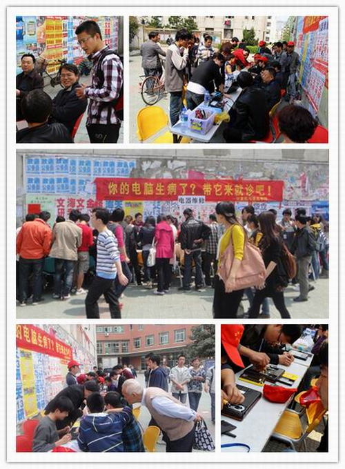 教师党员、学生党员等于屯溪路校区食堂广场开展“学雷锋义务维修电脑电器服务校园”活动。