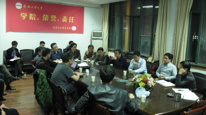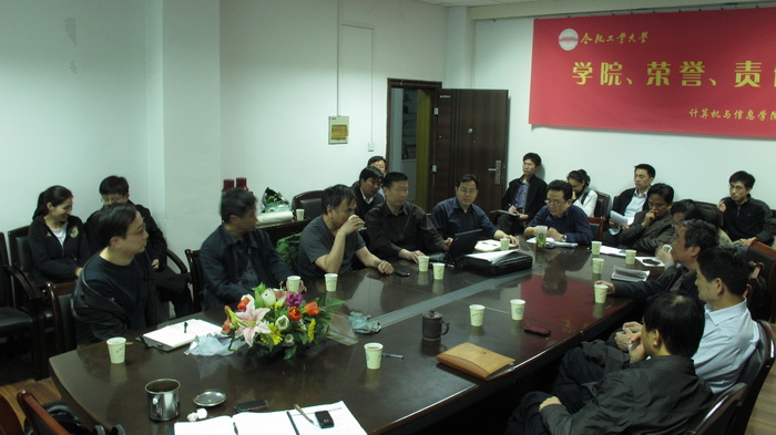 2012年4月16日晚19:30-21:00于学院会议室举行全体教授会议,围绕2011计划及要求,研讨学院未来发展规划,李廉教授、韩江洪教授、蒋建国教授、王浩教授等出席会议,刘晓平教授主持会议,会议听取了相关工作发展计划,对计算机、电子、通信、物联网等方向的集成创新进行了认真讨论,李廉教授最后分析了学校的科研发展态势,要求大家敢于直面自己的不足,敢于打破坛坛罐罐,凝炼核心技术,掌握科研杀手锏,为未来的五年乃至更长的学科发展做好准备。情感计算重点实验室、973项目基地、安全关键工程中心等相关人员出席会议。禁漫