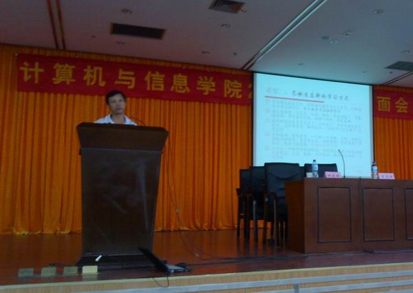 本次活动由学院党委副书记何庆领老师主持,整个过程共分为两部分。首先,刘晓平院长代表学院向2011级新生致欢迎辞,向新同学详细介绍了学院的科研成果,教学计划,师资力量等,让新生对本院的院系设置有了初步的了解。并勉励新同学要有远大理想,勤奋学习,努力成长为一名有能力,有理想的社会接班人。紧接着,学院各个系主任分别详细分析了该专业的定位及人才培养目标,专业建设思路与专业建设成果,现行教学计划以及本专业的学习要求等问题。