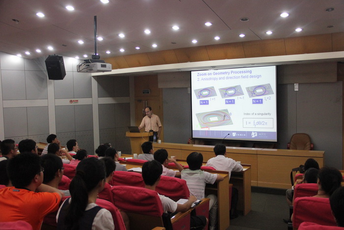 ,并做了题为《Numerical Geometry》的精彩报告。Bruno Lévy教授介绍了基于参数化网格处理等计算机图形学与可视化方向前沿成果。除计算机学院的师生外,数学学院、仪器科学与光电工程学院管理学院的老师和同学也参加了报告会。