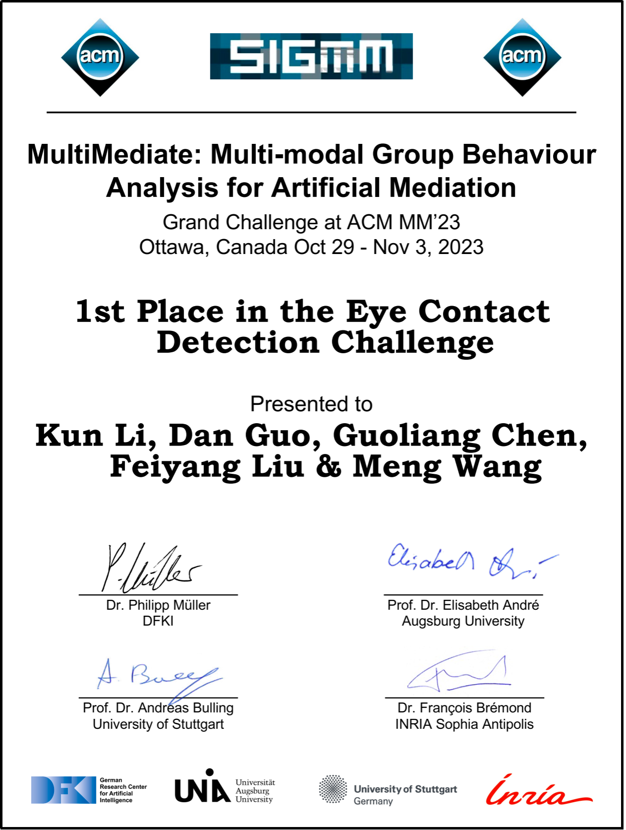 多媒体计算实验室团队由汪萌教授带队,在郭丹教授的指导下,由李坤、陈国良、刘飞扬等硕博研究生组成参赛队伍,在身体行为识别赛道以及眼神接触检测赛道斩获双赛道冠军,针对动作识别问题提出了一种有效的数据增强学习方案,在复杂的多类别身体行为识别和眼神接触检测中取得优异性能,获得双赛道第一名;团队在会议上发表论文,并在线介绍了相关的工作。