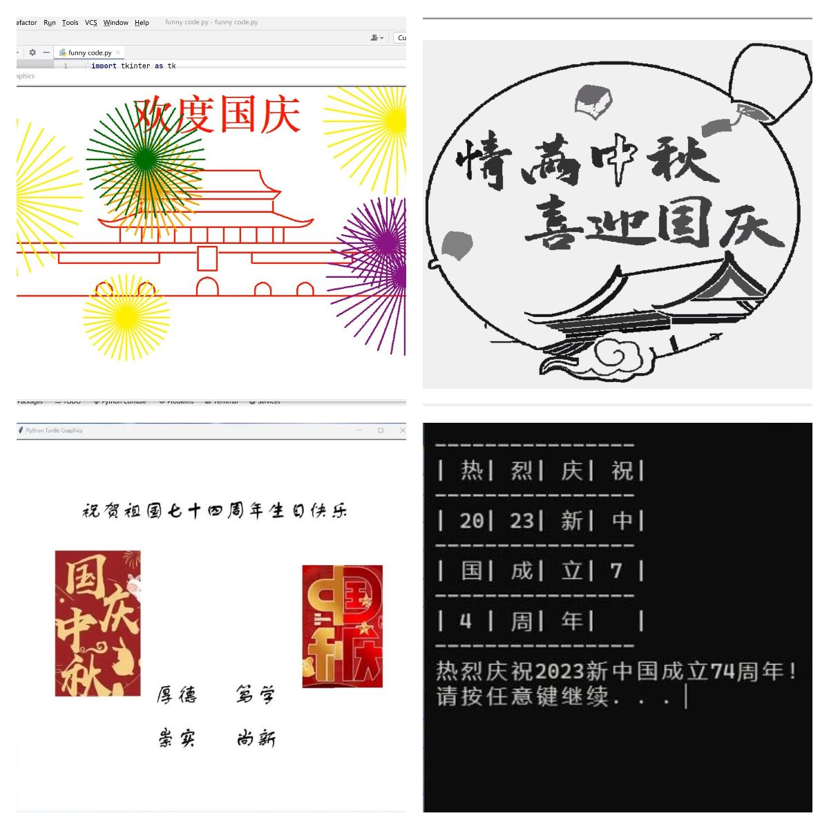 大赛期间,每位参赛者都展现出了创新精神和科技热情。他们以编程为画笔,以代码为颜料,创作出了一幅幅充满科技感和创新性的作品。有的作品以拼字游戏为载体,表达对祖国诞辰的衷心祝贺;或是在山水画的渲染下,展现“情满中秋,喜迎国庆”的热情;或是融入卡通色彩,红旗飘扬,体现在天安门城墙下的拳拳报国豪情。大赛共评选出一等奖三名,二等奖六名,三等奖8名。参赛选手充分发挥自己的想象力,运用出色的编程能力,将强烈的情感注入代码中,与新时代科技强国相结合,展现出对科技创新的追求和对祖国的热爱。