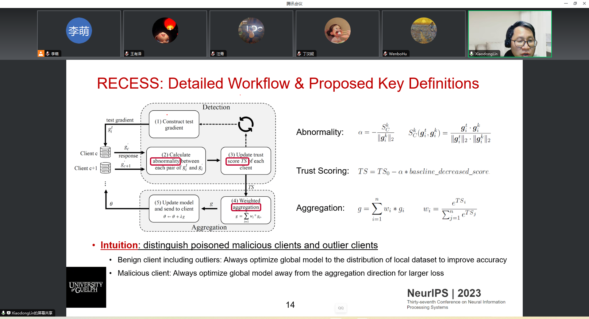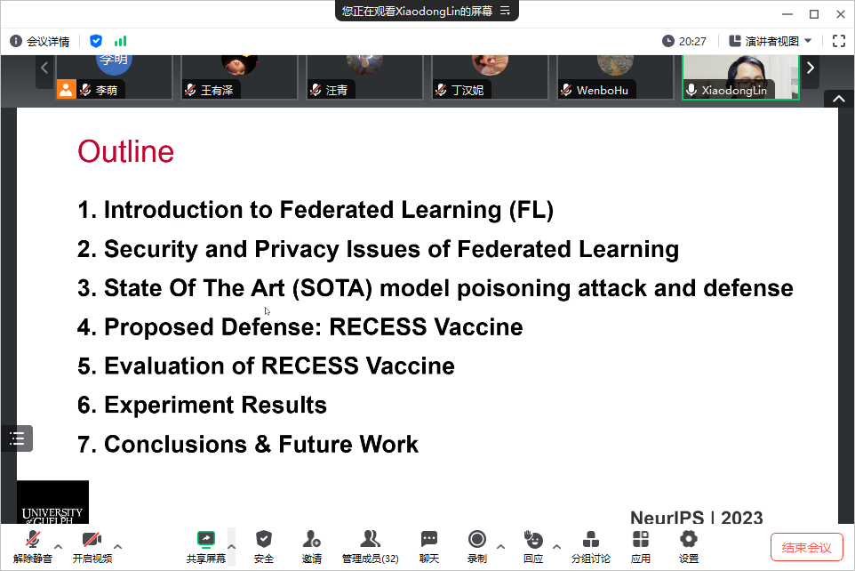 师生做了题为“RECESS Vaccine for Federated Learning: Proactive Defense Against Model Poisoning Attacks”的学术报告。李萌老师主持了本次报告会,学院相关研究方向的老师和学生参加了报告会。