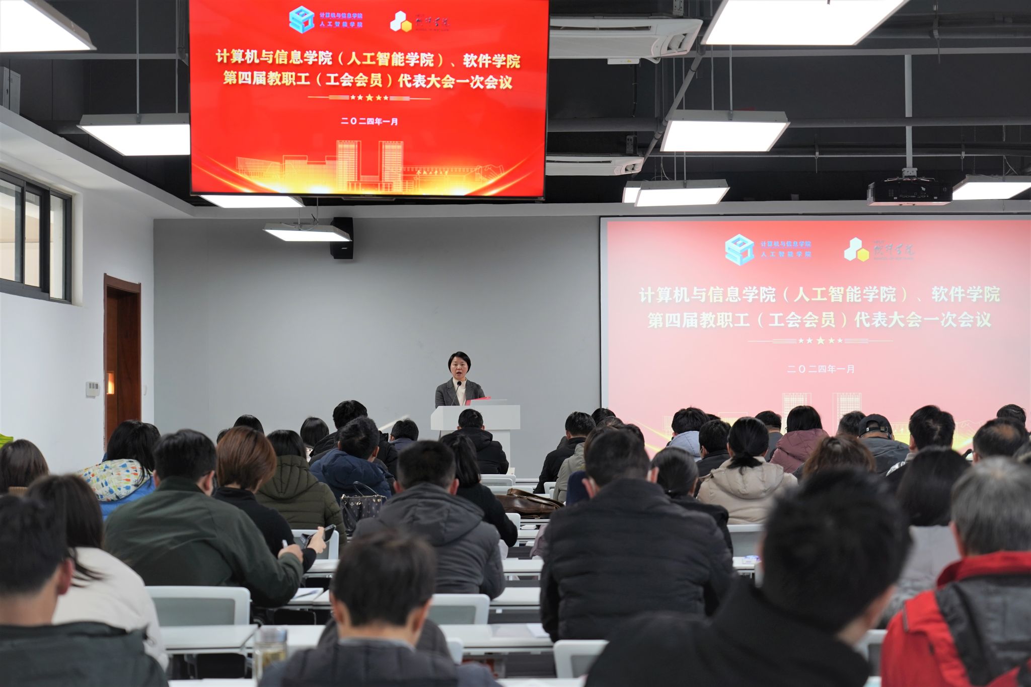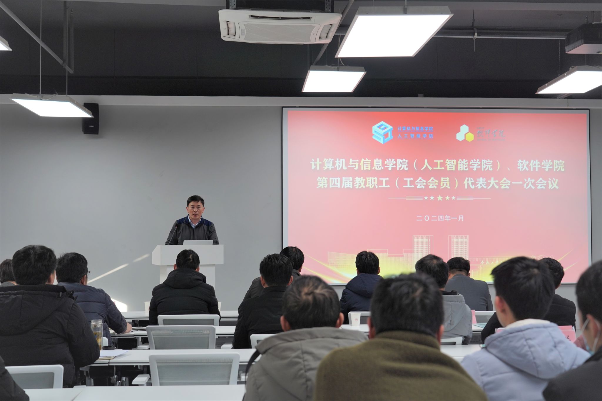 、软件学院第四届教职工代表大会暨工会会员代表大会在翡翠科教楼B501报告厅隆重举行。学校工会主席胡兴祥参加会议。学院党委副书记储文静主持会议。
