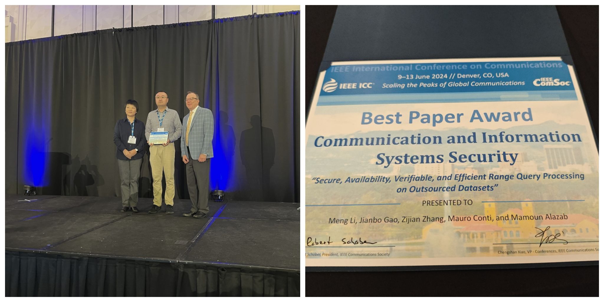 副研究员李萌课题组的研究成果“Secure, Availability, Verifiable, and Efficient Range Query Processing on Outsourced Datasets”在众多论文中脱颖而出,获得了本次大会最佳论文奖,这也是本次大会通信和信息系统安全分会唯一获奖论文。第二作者是禁漫