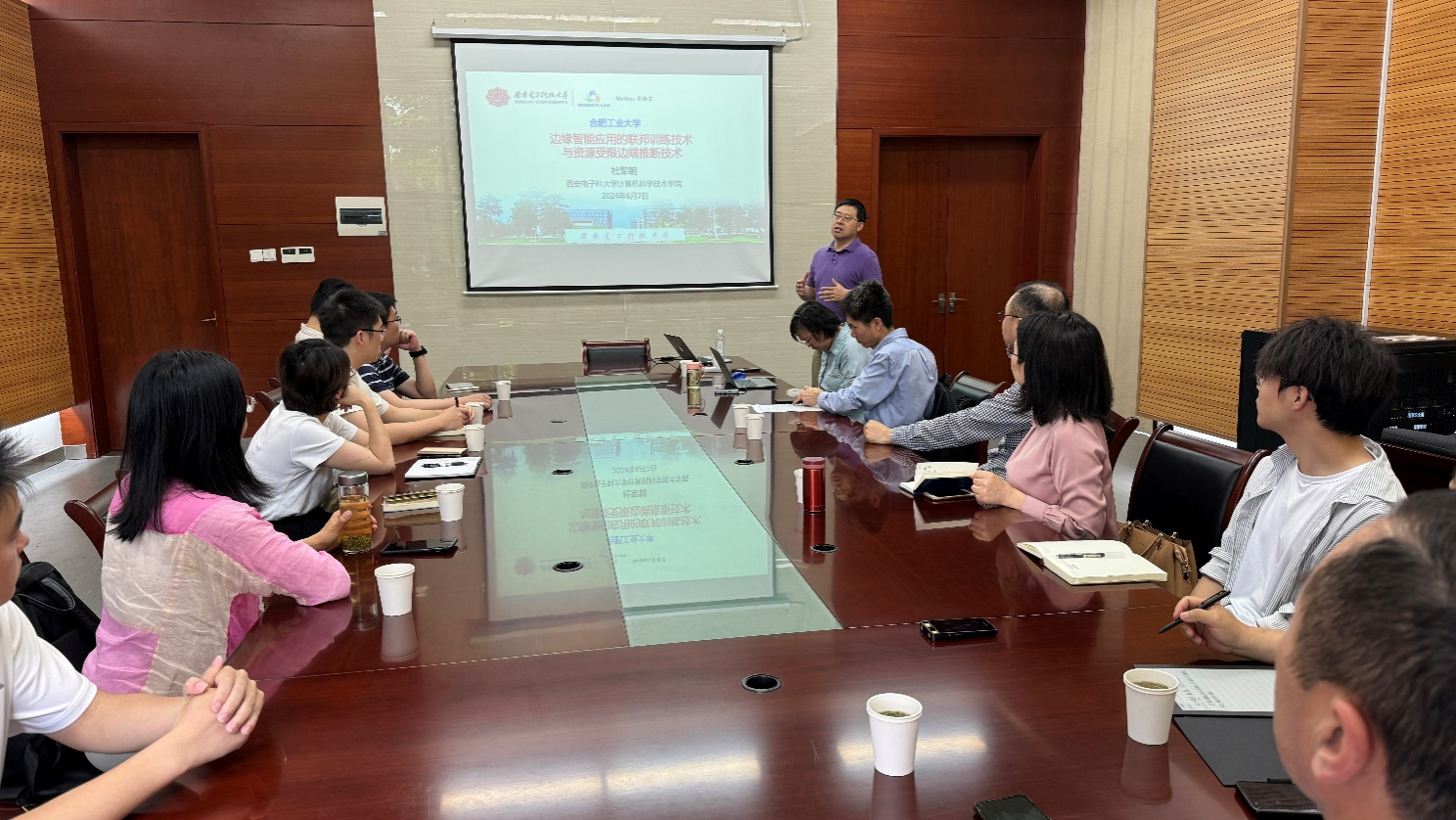 杜教授介绍了其科研团队在联邦学习以及边端推断技术等方面的研究成果,重点围绕多模态感知模型的联邦训练、双向知识蒸馏、联邦半监督学习、模型压缩、跨域自适应等展开。报告结束后,徐娟老师、卫星老师、乔焰老师等分别针对类对比学习的损失设置优化、协作联邦学习的公平性奖励机制设计和半异步联邦学习等问题和杜教授进行了请教讨论。