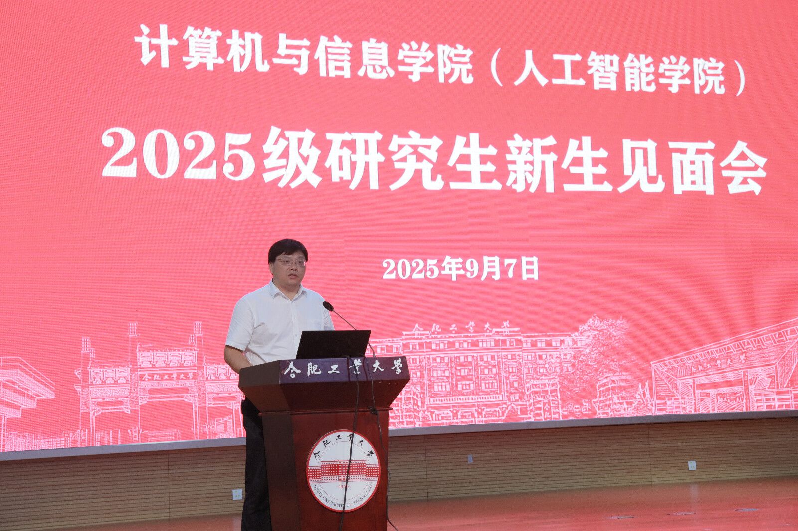 校长助理、院长洪日昌致欢迎辞。他首先代表学院向2025级研究生新生表示热烈欢迎,并系统介绍了学院的发展历程、学科建设、科研平台与资源条件。围绕新阶段的学习与成长,洪日昌向同学们提出三点期望:一是主动实现身份转变,积极融入学术环境,尽快完成从知识接受者到创新研究者的角色转换;二是始终保持科研好奇心,在人工智能与信息技术飞速发展的背景下,既要仰望星空、关注前沿,也要脚踏实地、勤思善问;三是着力锤炼心理韧性,全面提升综合素养,科研道路充满挑战,需学会应对压力、自我调适,实现身心健康与学术发展并进。他勉励新生大家以自信为舟、以优秀为帆,在人生的新阶段行稳致远。