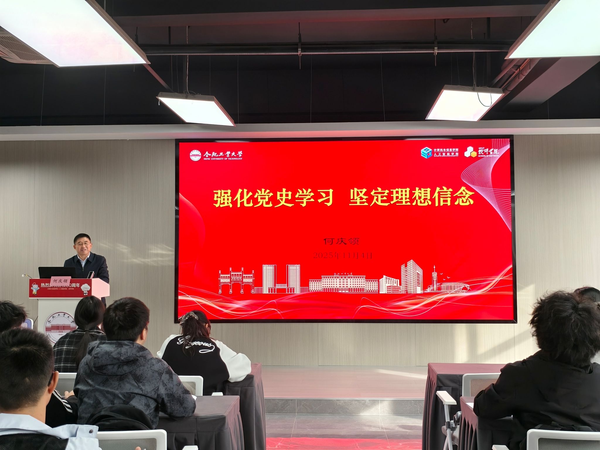 、软件学院分党校第74期大学生入党积极分子班第二次集中授课在翡翠科教楼B座501室开展,学院党委正处级组织员何庆领以“强化党史学习,坚定理想信念”为题主讲党课,培训班全体学员参加学习。