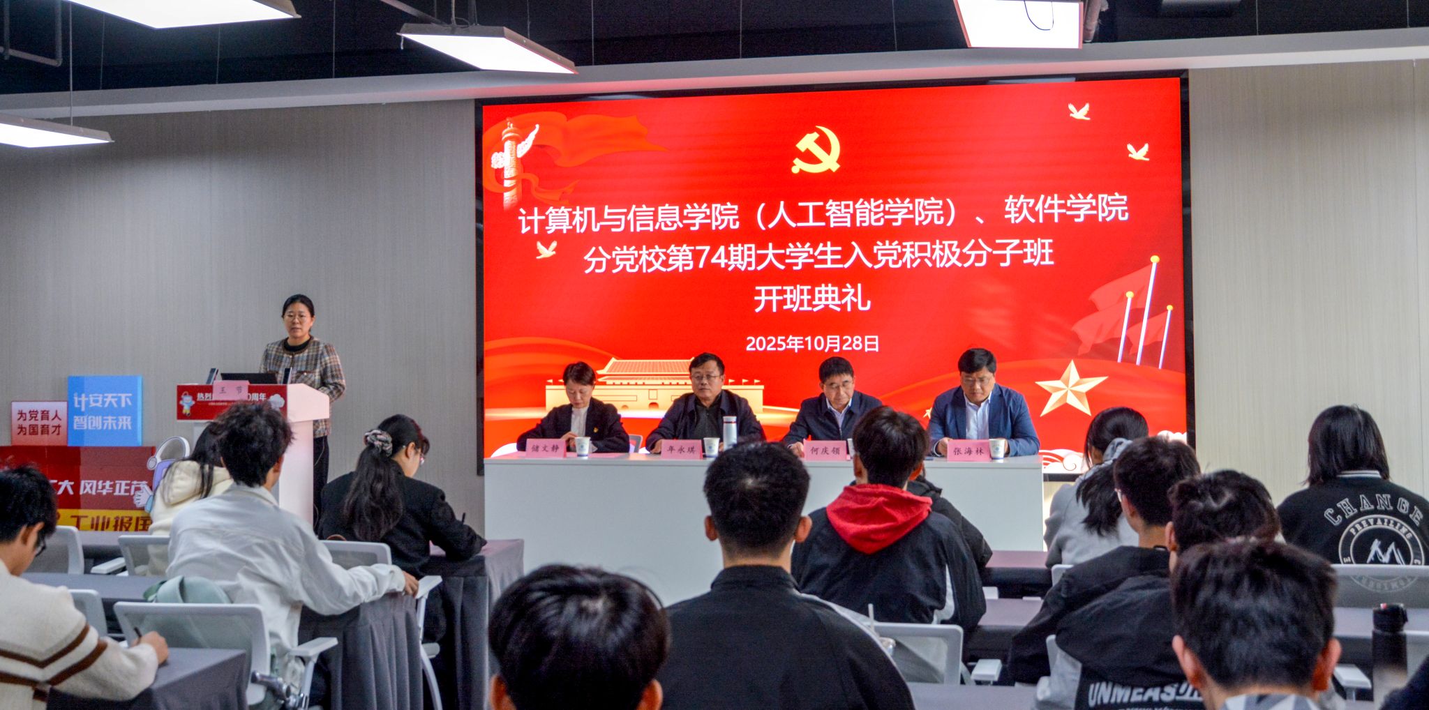 、软件学院分党校第74期大学生入党积极分子班开班典礼暨第一次专题党课在翡翠科教楼B座501室举行,学院党委、分党校相关负责同志及培训班全体学员参加典礼。