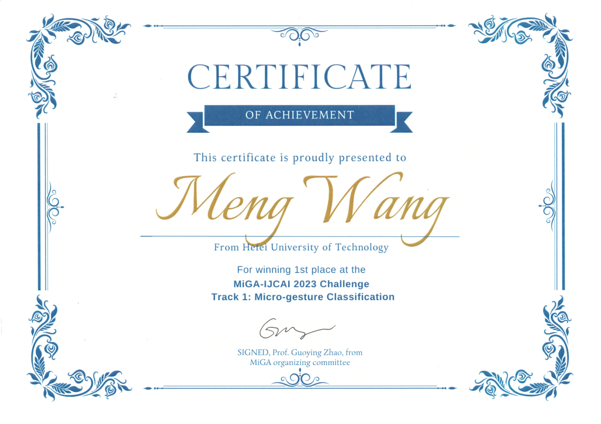 The 2023 International Joint Conference on Artificial Intelligence (IJCAI 2023) was held in Macau, China on August 19, 2023. The results of the 2023 Micro-gesture Analysis and Emotion Understanding Challenge (The 1st Workshop & Challenge on Micro-gesture Analysis for Hidden Emotion Understanding) were announced at the conference. The team of teachers and students from the Multimedia Computing Laboratory of Hefei University of Technology participated in this event for the first time and won the championship in the micro-gesture recognition track and the runner-up in the online micro-gesture detection.