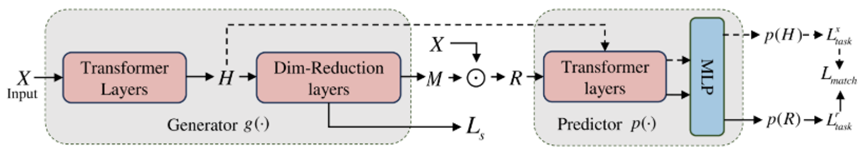 Figure 4. Detailed Design of the Dimension-Reduction Layer: The input is the hidden states H. The outputs are the final rationale mask M and the sum of all sparsity and continuity control losses